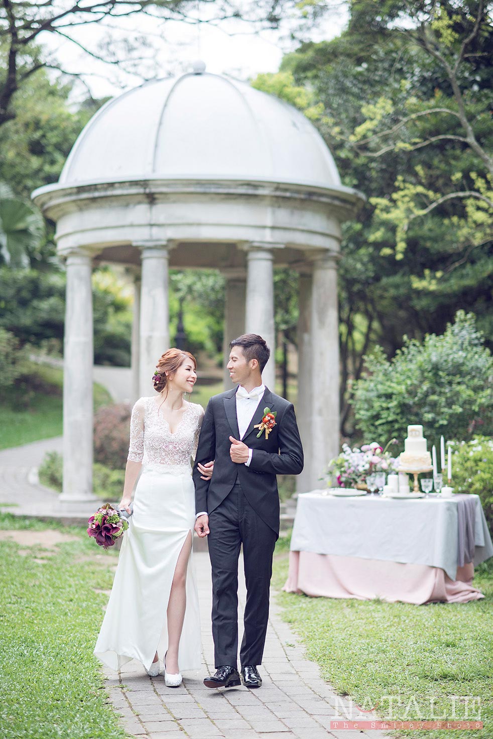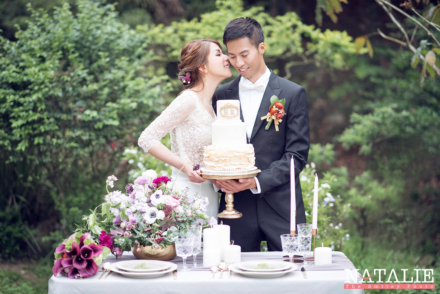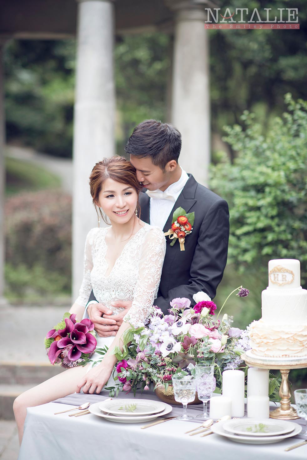 Helen 跟我見面的時候,說起她喜歡做甜品,當時我也沒想到她那是她「非常專業的」興趣。由於想配合精緻的甜品,我們一開始便決定做一個小庭園西式餐桌的佈置。直到拍攝那天,她把親手做的結婚蛋糕搬出來時,我們都目定口呆了,完全不輸專業的蛋糕師傅呀。